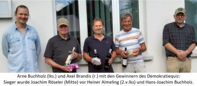 Dank geht an die Helferinnen und Helfer der Veranstaltung, auch an das bewährte Grillteam des TSV. Dank an Arne Buchholz und Axel Brandis für die Ausarbeitung eines Demokratiequiz, das die Teilnehmer durchaus gefordert hat. Dank auch an Pastorin Marx für ihre Besinnungs-Veranstaltung in der benachbarten Michaels-Kirche mit Gedanken zu den Werten des Grundgesetzes.
